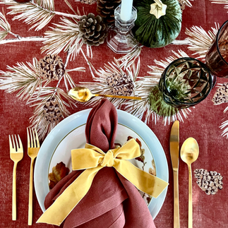 Autumn is all about warmth, rich colors, and layers of texture, and this table captures that feeling perfectly. I started with a deep terracotta tablecloth with subtle pine and gold details, which immediately sets a cozy, inviting backdrop that feels like the season itself has come indoors. It’s the kind of table that makes you want to linger over a glass of wine or a warm fall cocktail.